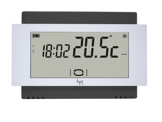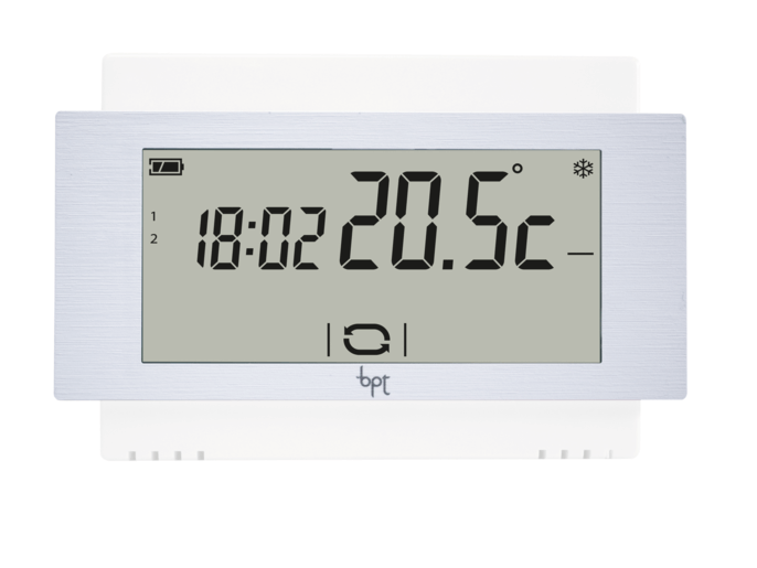 Thermostat mural blanc, à écran tactile. Alimentation par piles 2x1,5 AA.