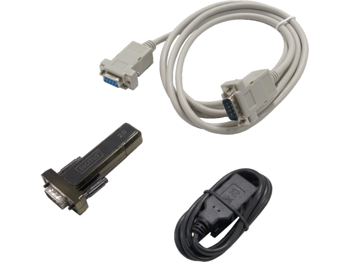 Câble de programmation. L’emballage contient un câble RS232, un convertisseur RS232-USB à utiliser pour la programmation de la centrale PXC08.