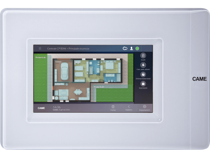 Terminal à écran tactile. Ce terminal permet, par le biais d’une interface graphique simple et intuitive, la programmation de la centrale ainsi que le contrôle total de l’installation. La navigation a lieu au moyen du menu de commande ou de cartes graphiques avec les images des différentes pièces. Connexion directe à la centrale par le biais de l’interface PXITS43 (max. 4 terminaux). Afficheur 4,3” 16/9 résolution 480x272. Installation murale. Conformité norme EN 50131-3. Coloris blanc.