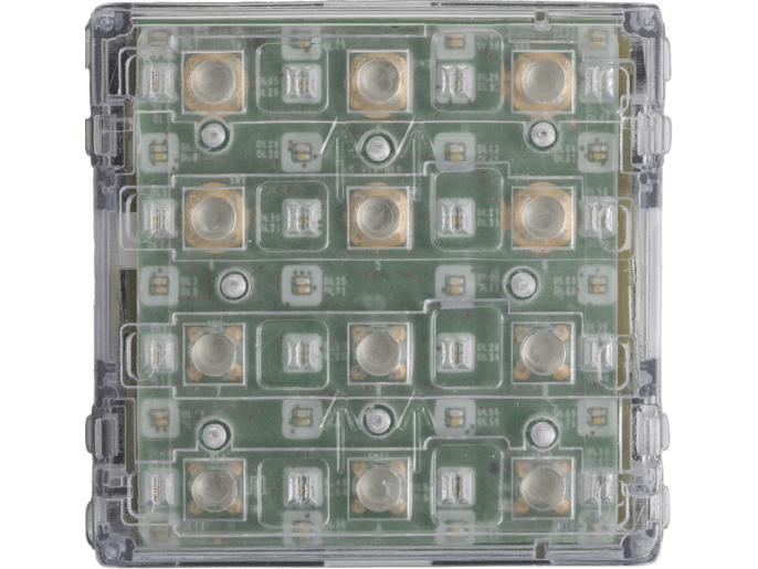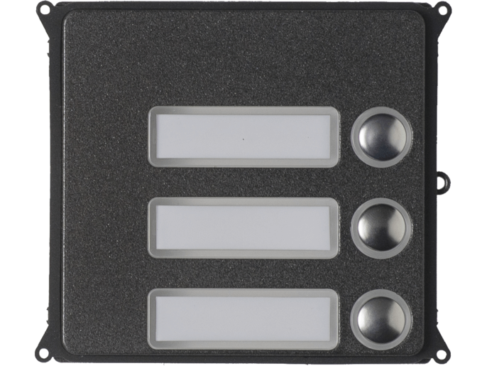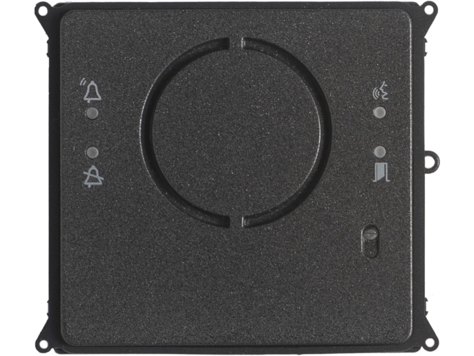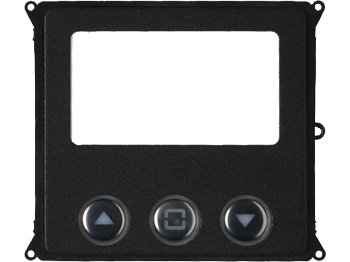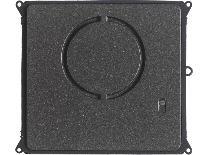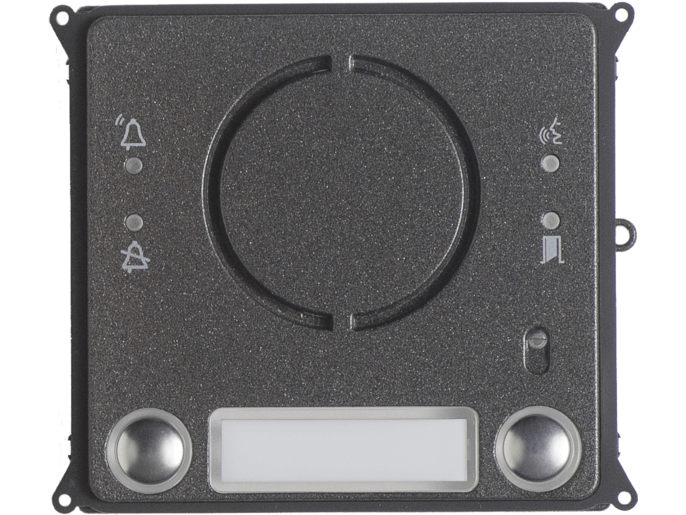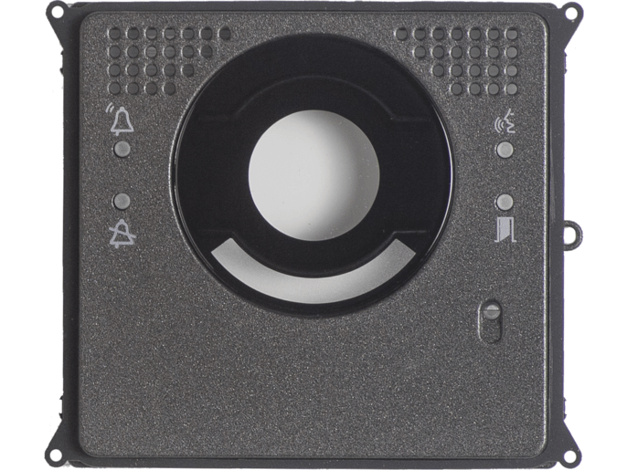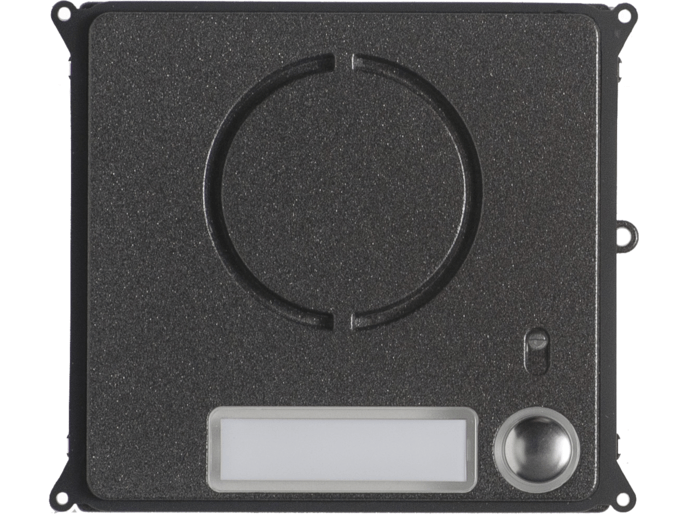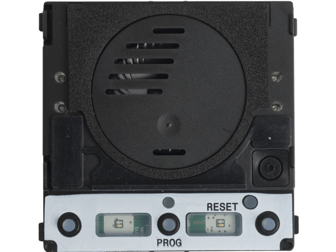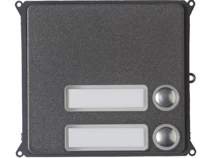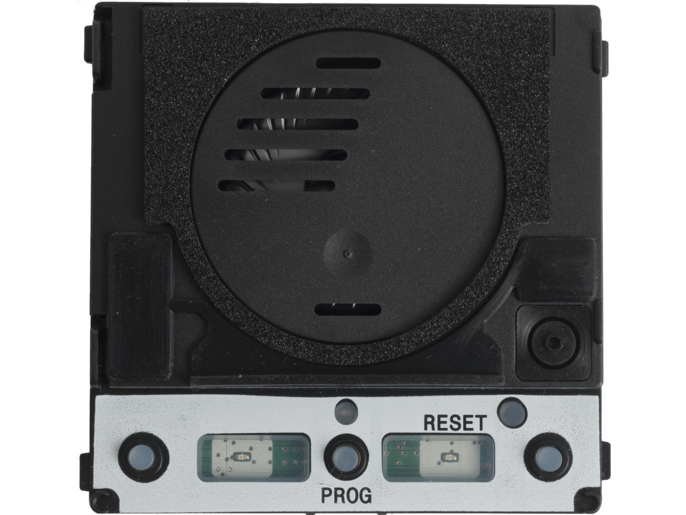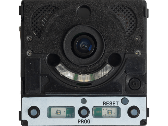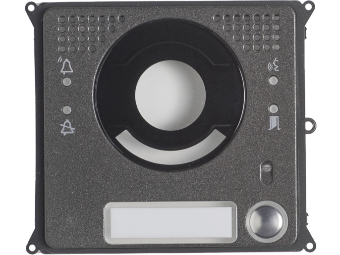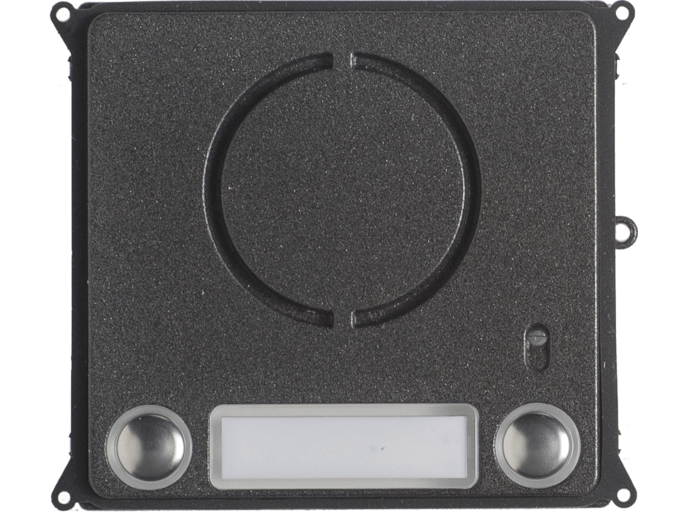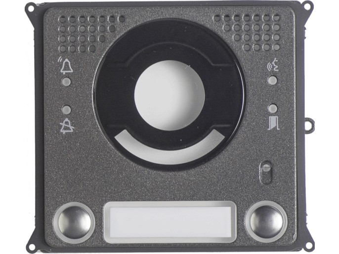 Module interphone pour système X1.Module électronique avec corps en polymère technique et 2 boutons d’appel avec double rétroéclairage (bleu ou blanc) des étiquettes « noms ». Doté d’une commande locale pour serrure de verrouillage électrique, d’un contact auxiliaire (1A, 30V max.), d’entrées pour bouton ouvre-porte et la signalisation de l'état de la porte (E/S programmable), sortie pour l'activation de caméras externes (E/S programmable). Doté d’une entrée vidéo caméra analogique externe. Doté sur la façade d’une LED de signalisation de l’état de l’installation. Réglage audio du micro, du haut-parleur et du délai d'activation de la serrure de verrouillage électrique. Programmation manuelle ou par PC par le biais du connecteur MINI USB frontal. À compléter avec la façade interphone. Combiné à la façade correspondante, il garantit un degré de protection contre l’eau et la poussière IP54.