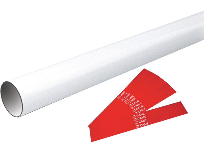 Ovale slagboom van wit gelakt aluminium met rubberen stootprofiel, vulprofiel, lichtsnoer, aansluitkabel en rode zelfklevende reflecterende stroken. Boomlengte: 3 m.