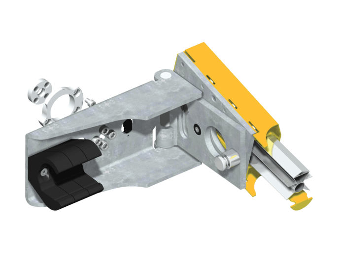 Rechtsgemonteerde slagboom van verzinkt en gelakt staal met mogelijkheid voor uitrustingen.