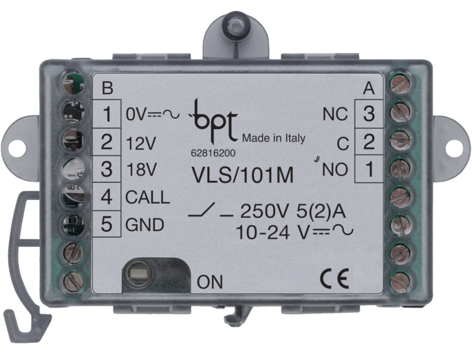 Unidade de relé para serviços auxiliares.Relé para serviços auxiliares (luz das escadas, sirenes, aberturas, etc.), realizado em caixa miniaturizada para instalação em quadros elétricos (EN50022) e dimensões 1 módulo DIN baixo perfil. O relé dispõe de contactos de comutação de tipo impulsivo (poder de corte 5 A resistivos - 2 A indutivos, tensão máx. 250 V AC) e pode ser controlado em corrente contínua ou alternada de 10 V a 24 V, ou por sinais elétricos de baixo nível provenientes da instalação. Necessita de alimentação 10 ÷ 24 V AC - DC - 40 mA máx.