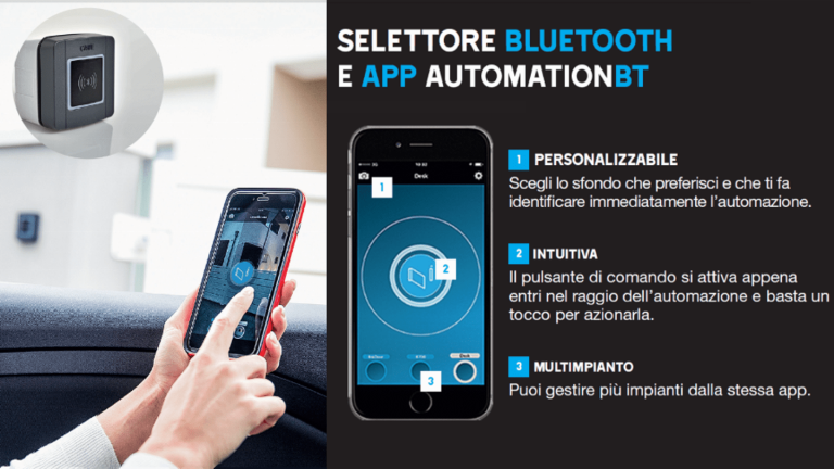 The Bluetooth selector available in the 15, 50 and 250 users version, connects to the AutomationBT app and allows you to open the operator directly from your device.