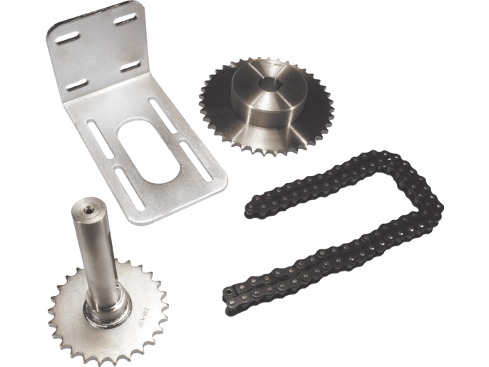 Sistema de transmissão por corrente (altura portão acima de 5,5m) completo de eixo com pinhão Z = 26 para eixo cabo motorredutor, pinhão Z = 40 com corrente e junta para corrente de ½” e suporte de ancoragem ao motorredutor.