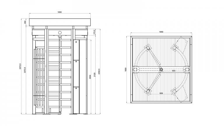 Elektromechanisches Drehkreuz mit 3 Sektionen mit 120°, integrierten Säulen für Bedienelemente, Überdachung und Regenablauf.