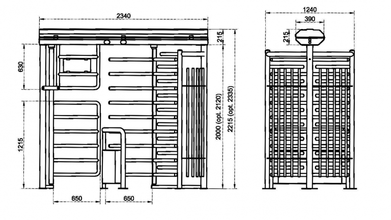 Elektromechanisches Drehkreuz mit 3 Sektionen mit 120° und motorisiertem Durchgangsportal.