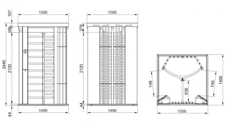 Elektromechanisches Drehkreuz aus Edelstahl mit 3 Sektionen mit 120°, integrierten Säulen für Bedienelemente, Überdachung und Bodenkonstruktion.