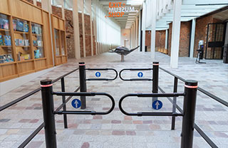 Professionelle Besucherlenkung mit Ticketing-Integration, Kapazitätskontrolle und eleganten Designs – für Museen, Messehallen mit Ausstellerbereich-Trennung und Sonderausstellungen.