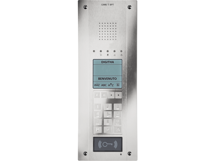 Placa de calle de videoportero monolítica, a prueba de vándalos, para sistema XIP, tratamiento de doble acabado.Placa de calle con placa frontal de acero inoxidable AISI 304 y tratamiento de doble acabado. Sensor de videocámara PAL/NTSC con resolución de 680x512, con microprocesador incorporado para el procesamiento digital de la señal. Objetivo "wide eye" con un encuadre de 100° en horizontal y 82° en vertical y regulación digital del zoom. Se caracteriza por la pantalla gráfica LCD, 4 botones de función que permiten navegar por la interfaz gráfica, teclado alfanumérico para la llamada digital y el control de accesos y lector RFID. Con mando local para cerradura eléctrica, entradas para pulsador abrepuerta y para la indicación del estado de la puerta, salida para activar videocámaras externas. Ajuste del audio del micrófono y del altavoz. En la parte delantera tiene LED para las indicaciones visuales del estado de la instalación. Dip-switch para adaptar la impedancia de línea. Programación manual "Quick Start", con menú guiado en pantalla, o bien desde PC a través del conector MINI USB. Grado de protección IP54 frente a agua y polvos.