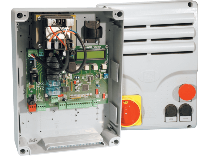 ZLX24SA - Cuadro de mando multifunción, con alimentación de 230 V AC, para cancelas de dos hojas batientes de 24 V, con pantalla gráfica de programación y señalización, autodiagnosis de los dispositivos de seguridad, Adaptive Speed & Torque Technology, BUS CXN, 4 entradas de seguridad y memorización de hasta 1000 usuarios.