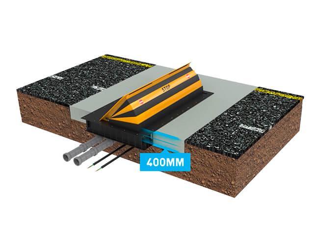 Le road blocker, dont l’élément mobile se soulève jusqu’à un angle de 45°, a été conçu de manière à ne pas nécessiter d’excavation profonde pour son installation : en effet, le nouveau HRB ne fait que 400 mm de profondeur, de manière à accélérer le processus d’installation, à réduire les coûts et à ne pas avoir d’impact sur les infrastructures souterraines existantes. Il est donc idéal dans les contextes urbains et métropolitains, car il a été conçu pour durer dans le temps et résister à des cycles d’utilisation et de sollicitation intenses, comme le passage continu de véhicules sur sa surface. La structure non visible est également conçue de manière à ne pas être déplacée parle passage des véhicules sur la plate-forme antidérapante au niveau de l’asphalte. En effet, le système de charnière a été spécifiquement conçu pour que les véhicules puissent passer sans secousses et sans générer de bruit.