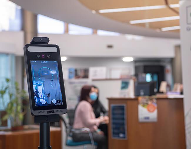 Lorsque quelqu’un se place devant le thermoscanner, grâce aux instructions données par le guide vocal, un balayage du visage est effectué qui détecte, sans besoin de contact physique et sans l’aide de personnel qualifié, si la température corporelle est inférieure à 37,5° et si la personne porte correctement le masque. Ce n’est que si les deux exigences légales sont respectées que l’entrée est autorisée par un double signal, à la fois lumineux et vocal, garantissant un accès sûr à ceux qui doivent entrer dans la filiale et à ceux qui y travaillent chaque jour.