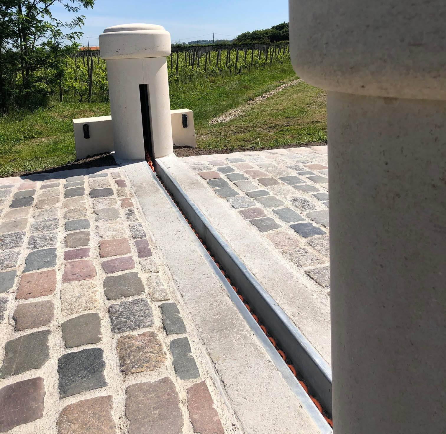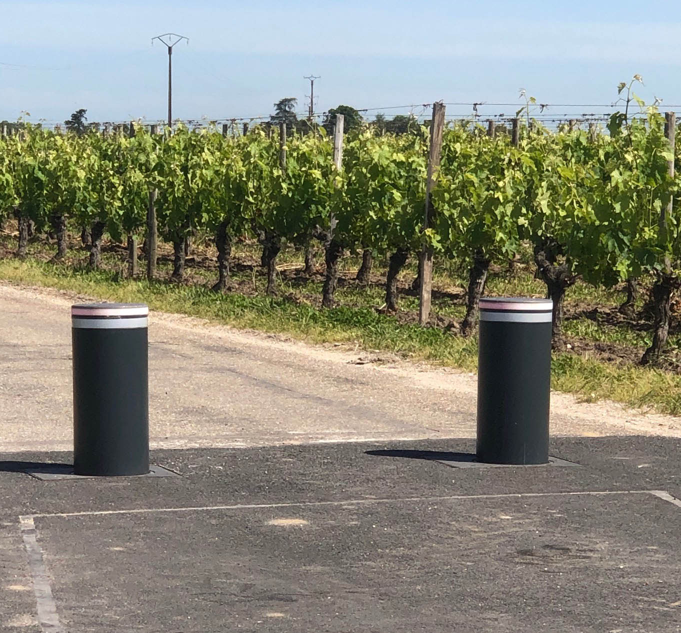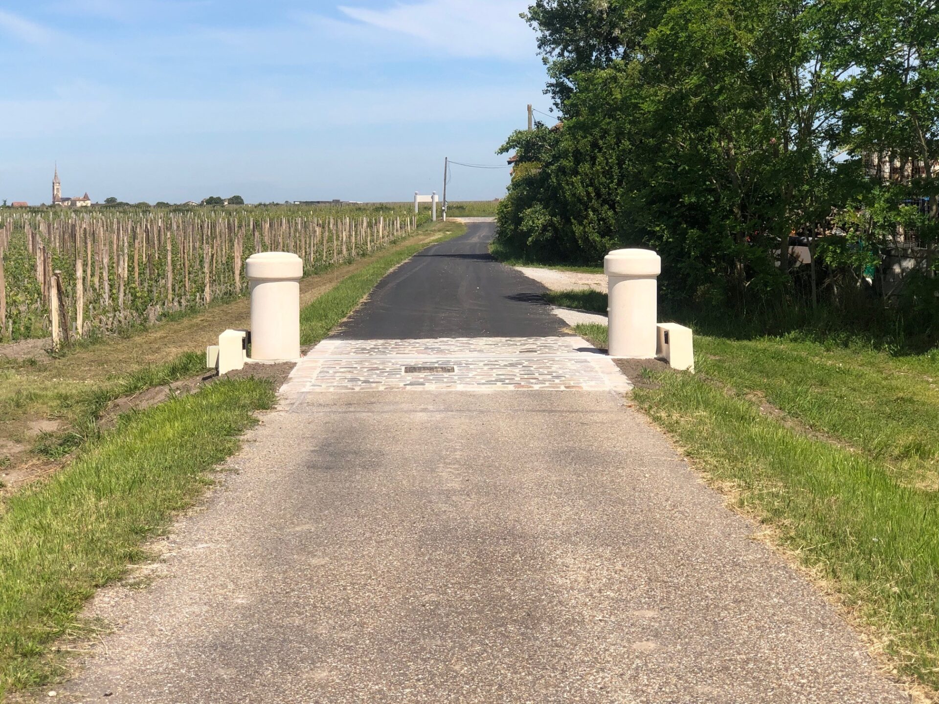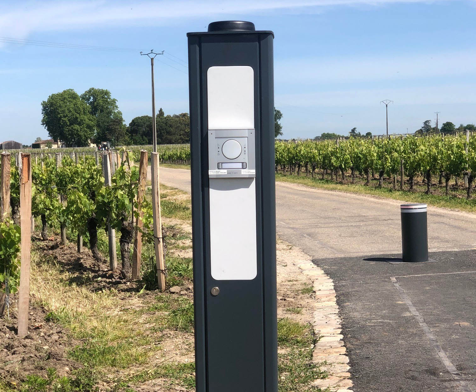 Pour le deuxième accès, nous avons installé deux bornes G6EVO D250/HT 750mm, avec RAL et bandeau LED, ainsi qu’un Totem CITYSQUARE avec interphone MTM GSM et lecteur longue portée, notamment pour les véhicules agricoles. Deux boucles au sol pour les deux accès ont été également intégrées, permettant ainsi de détecter tout type de véhicule.