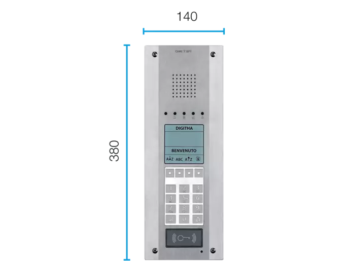 Poste externe avec plaque frontale en acier inox AISI 304 et traitement double finissage. Caractérisé par un afficheur graphique LCD, 4 touches de fonction permettant la navigation par le biais de l’interface graphique, clavier alphanumérique pour appel numérique et contrôle d’accès et lecteur RFID. Doté d’une commande locale pour serrure de verrouillage électrique, entrées pour bouton ouvre-porte et la signalisation de l’état de la porte, sortie pour l’activation de caméras externes. Réglage audio du micro et du haut-parleur. Doté sur la façade d’une LED de signalisation de l’état de l’installation. Micro-interrupteurs pour l’adaptation de l’impédance de ligne. Programmation manuelle « Quick Start » avec menu guidé sur l’écran ou par PC par le biais du connecteur MINI USB. Degré de protection contre l’eau et la poussière IP54.