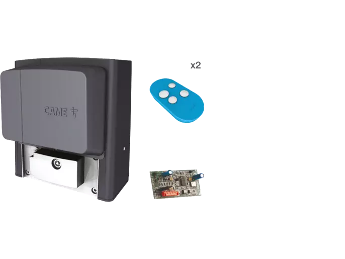 Automatisme avec moteur 230 V, complet de carte électronique avec afficheur de programmation, décodage radio intégré, gestion des mouvements et détection d’obstacles avec fins de course mécaniques pour portails coulissants jusqu’à 400 kg et 14 m de longueur. Couvercle gris RAL7024.