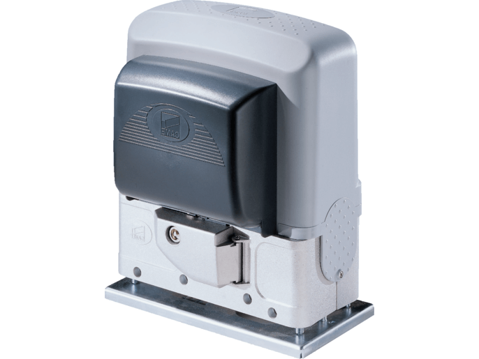 Automazione completa di scheda elettronica con display di programmazione, decodifica radio incorporata e finecorsa meccanici per cancelli scorrevoli fino a 800 kg e 20 m di lunghezza.