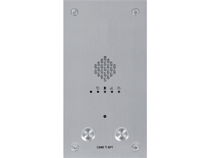 Protuvandalska portafonska pločica s 2 tipke za poziv.Pločica od četkanog inox čelika, s protuprovalnim vijcima i protuprovalnim tipkama. S čeličnom kutijom za podžbuknu montažu. Za realizaciju vanjske jedinice mora se kombinirati s portafonskim modulom. Stupanj zaštite od vode i prašine IP54.