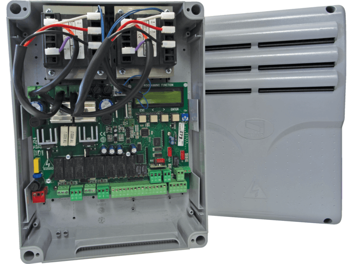 ZLX24SA - Multifunctional control panel, with 230 V AC power supply, for 24 V double-leaf gates, with programming and graphical signaling display, self-diagnosis of safety devices, Adaptive Speed & Torque Technology, CXN BUS, 4 safety inputs and storage for up to 1000 users.