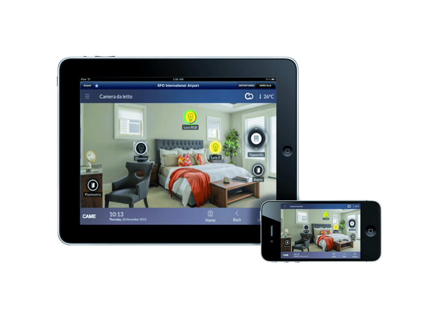 Navigation takes place through simple function menus or through specially programmed graphic maps that reproduce the images of the various rooms in the house. All the functions foreseen in the system (eg: automation management, thermoregulation, lighting control, opening and closing of blinds or curtains, intrusion detection system control and scenario management) are easily available using the portable device in which the CAME Domotic APP is installed.