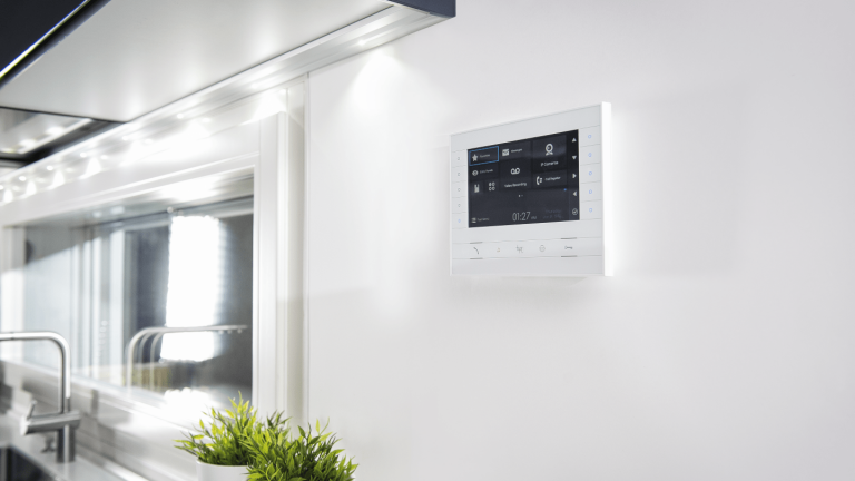 Perla is the hands-free wall-mounting intercom, characterized by the central blue backlit ring nut that allows to activate the many functions available.