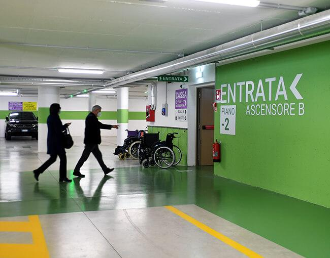 La soluzione di parcheggio è stata ingegnerizzata seguendo i criteri del frictionless parking riducendo al minimo il contatto degli utenti con le superfici e i dispositivi comuni, fondamentale soprattutto in questo periodo di emergenza sanitaria. Il parcheggio è infatti dotato di sistema Telepass per due ingressi e due uscite al secondo e al terzo livello, in modo da agevolare e velocizzare ancor di più il transito dell’utenza eliminando la fase di pagamento manuale della sosta, che avviene in maniera completamente automatica per la massima sicurezza degli utenti. A questo si affiancano i metodi di pagamento contactless e gli strumenti personali come le tessere di prossimità o ticket cartacei per l’utenza ospedaliera e i visitatori; i dipendenti abbonati per accedere al parcheggio possono infatti utilizzare la stessa tessera dell’ospedale, mentre i pazienti e relativi accompagnatori ricevono un abbonamento sotto forma di ticket cartaceo valido per il periodo del ricovero. Il pagamento in contanti è comunque disponibile presso le due casse automatiche o tramite operatore alla cassa manuale, che agisce anche da presidio locale e punto per la gestione degli abbonamenti.