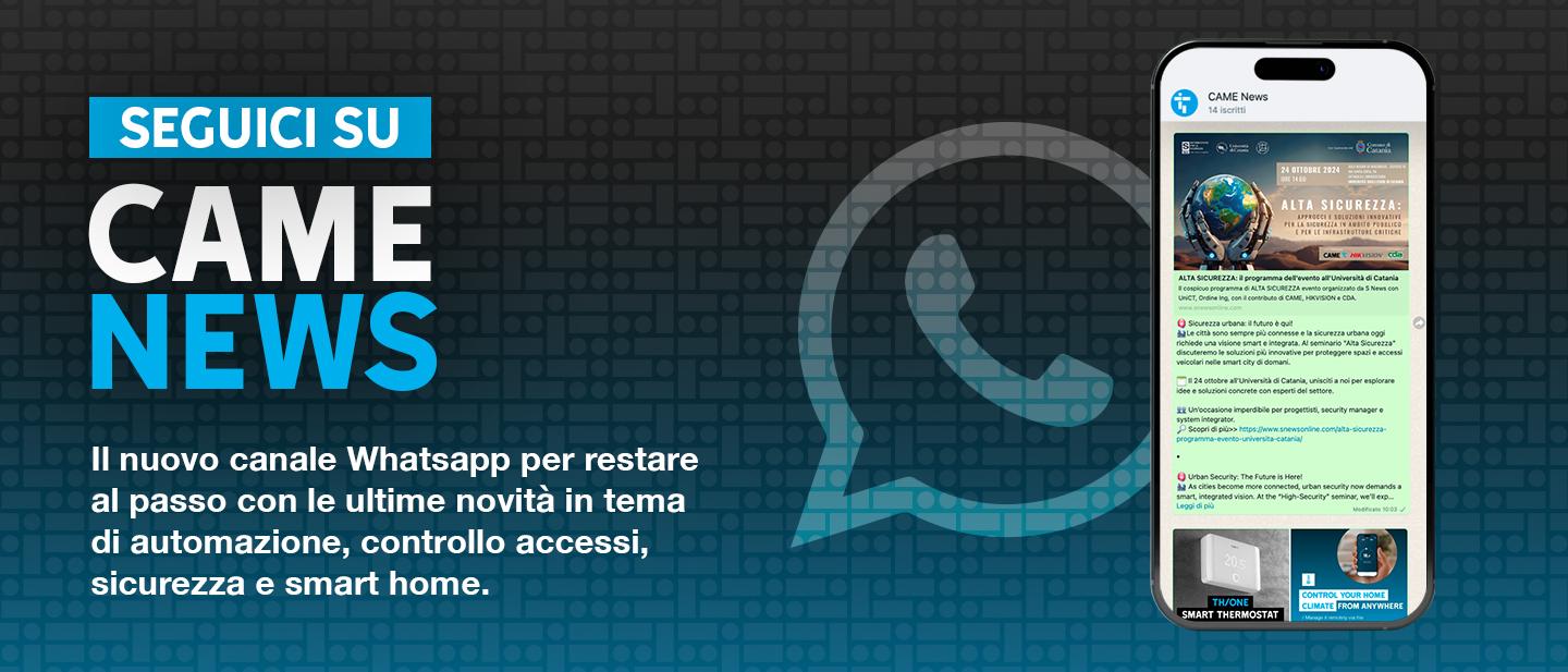 Siamo felici di presentare il nostro nuovo canale Whatsapp “CAME News“, uno strumento pensato per chi desidera restare sempre informato su tutte le ultime novità negli ambiti automazione, controllo accessi, sicurezza e smart home.