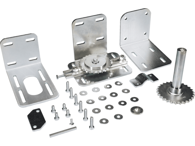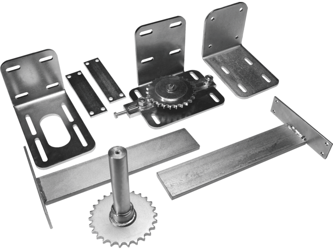 Sistema de transmisión con cadena (portón alto más de 5,5 m) completo con árbol con piñón Z = 26 para árbol hueco motorreductor, piñón Z = 40 con cadena y junta para cadena de 1/2” y bridas de anclaje al motorreductor.