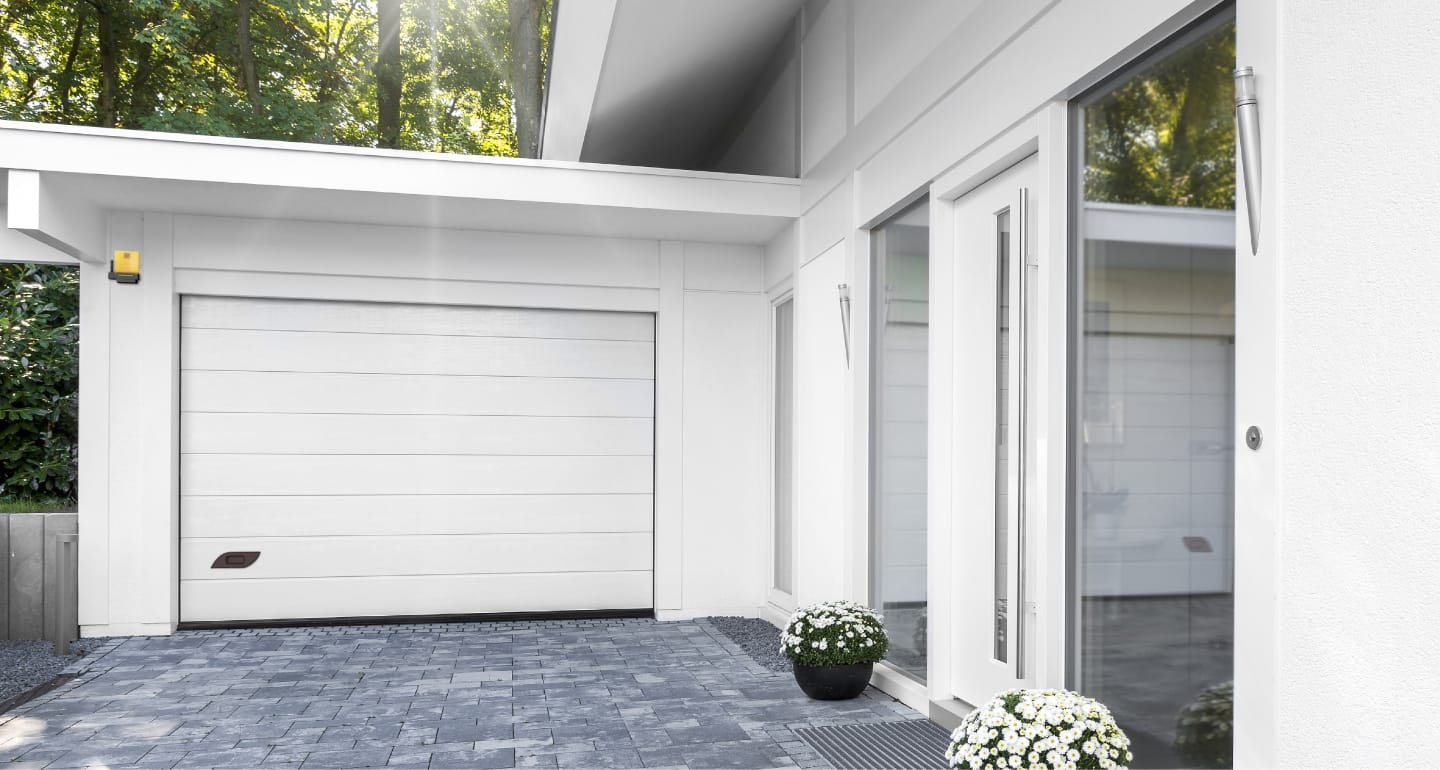 An elegant door for pedestrians to pass through, integrated into a GO Italia residential sectional door, which makes entering and exiting easier for people, wheelchairs, prams and bikes thanks to its rounded edges.
