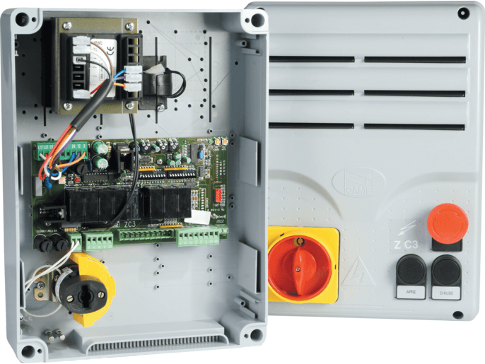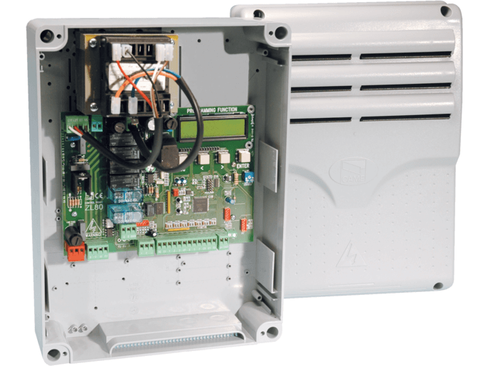 Quadro de comando multifunções para portas com duas folhas, com bloqueio de segurança e botões, com ecrã gráfico de programação e sinalização com autodiagnóstico de dispositivos de segurança.