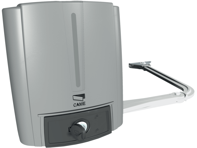 - Motoriduttore 24 V irreversibile completo di scheda elettronica con display funzioni, decodifica radio incorporata e braccio snodato di trasmissione per cancelli a battente con C Max. 200 mm con anta fino a 2,3 m e 200 kg di peso.