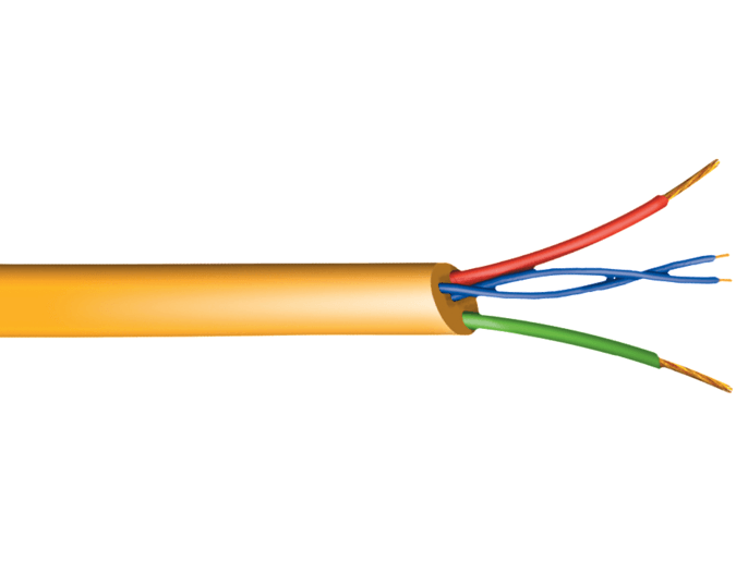 Confezione da 500 m di cavo a 3 doppini twistati sezione 0,28 mm² e da 2 conduttori di sezione 1,5 mm², Classe CPR Eca.Cavo con guaina isolante esterna in PVC diametro 11 mm colore giallo RAL 1021. Doppini con cordatura ad elica passo 70 mm. Conduttori in rame stagnato. Colore doppini blu/blu-bianco, marrone/marrone-bianco, arancio/arancio-bianco e colore rosso e verde per conduttori alimentazione. Impedenza nominale doppini 100 ohm (f=1 MHz), capacità 50 pF (a 20°C). Raggio minimo di curvatura cavo 150 mm. Conforme alle norme CEI 46-6 ultima edizione/CEI 20-11 ultima edizione/CEI 20-37.