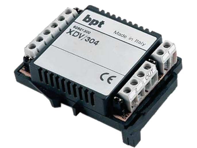 Distributore video amplificato a 4 uscite per distribuzione del segnale.Contenitore in materiale plastico per l'installazione in quadri elettrici (EN50022) e dimensione 6 moduli DIN basso. Dotato di 4 uscite video verso i derivati interni, 3 uscite di alimentazione (14 ÷ 18 V DC) e 4 morsetti per il collegamento IN/OUT dalla colonna montante. Ogni uscita dispone di 1 jumper per la chiusura della impedenza di linea. Necessita di alimentazione 14 ÷ 18 V DC - 60 mA max. Grado di protezione acqua e polveri IP30.