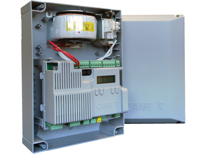 - Quadro comando multifunzioni per cancelli a due ante battenti, con gestione dei finecorsa e regolazione della velocità di rallentamento.