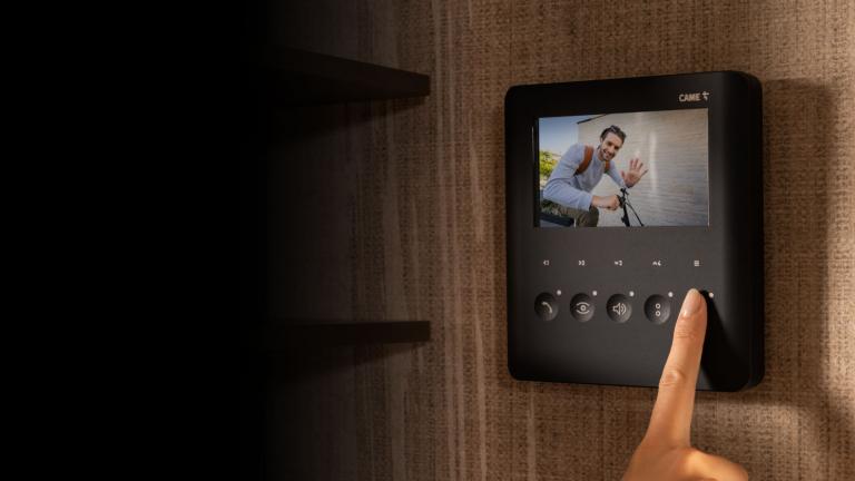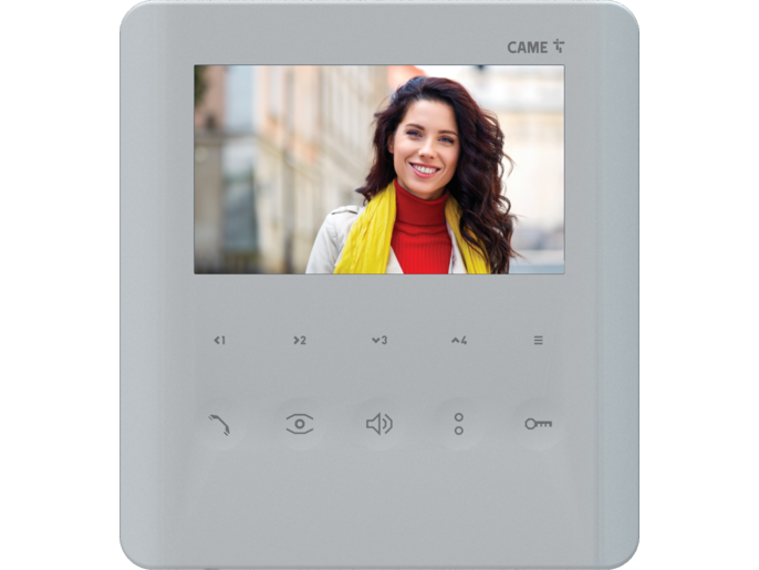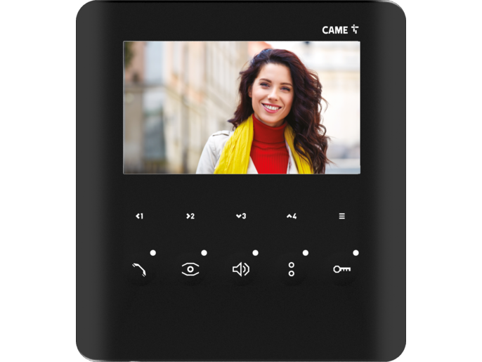 Wall monitor with 5˝ color LCD display equipped with OSD for adjusting video parameters (brightness, color, contrast). The 5 main touch buttons are used to manage the primary functions such as answering and hanging up communication, door opening, self-insertion of entry panel videos, ringtone adjustment/exclusion (with signaling LED when excluded) and the sending of a programmable auxiliary command. Suitable for multi-user systems as it allows up to 6 intercom calls and the sending of the "Panic" signal for the porter to call for help. If configured it enables up to 4 additional auxiliary commands, alternative to intercom calls. It allows manging the "gate opener" function and displays the status of the gate controlled by means of a signaling LED. It includes a bracket for wall mounting on horizontal or vertical 503 box and on Ø 60 mm round box. Compatible with the X1 and XIP systems.